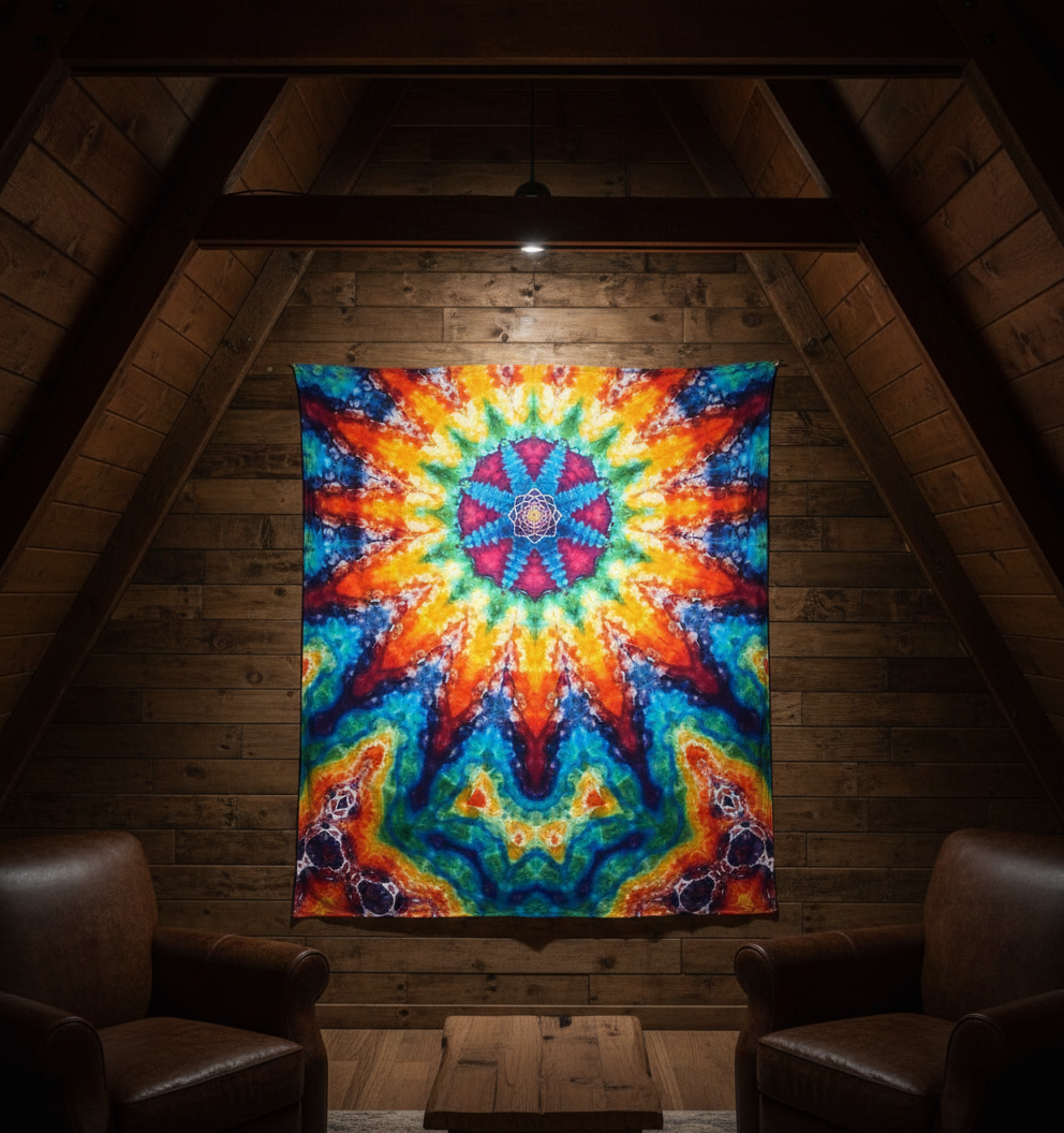 8 -> 16 point mandala. Hemmed edges. Custom cloth hanging loops